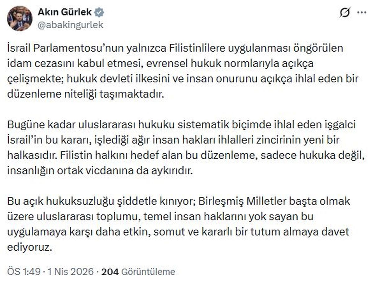 Adalet Bakanı Akın Gürlek, İsrail parlamentosunun sadece Filistinlilere uygulanacak idam cezasını kabul etmesini evrensel hukuk normlarına aykırı ve insan onurunu zedeleyen bir uygulama olarak nitelendirdi. Uluslararası toplumu bu hukuksuzluğa karşı etkili ve kararlı adımlar atmaya çağırdı.