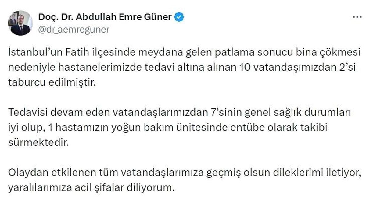 Fatih'te yaşanan bina çökmesi sonrası hastaneye kaldırılan 10 yaralıdan 2’si taburcu edilirken, 7 kişinin sağlık durumu iyi ve 1 kişinin yoğun bakımda entübe halde olduğu açıklandı. İstanbul İl Sağlık Müdürü Doç. Dr. Abdullah Emre Güner, yaşanan olayda yaralanan vatandaşlara acil şifalar diledi.