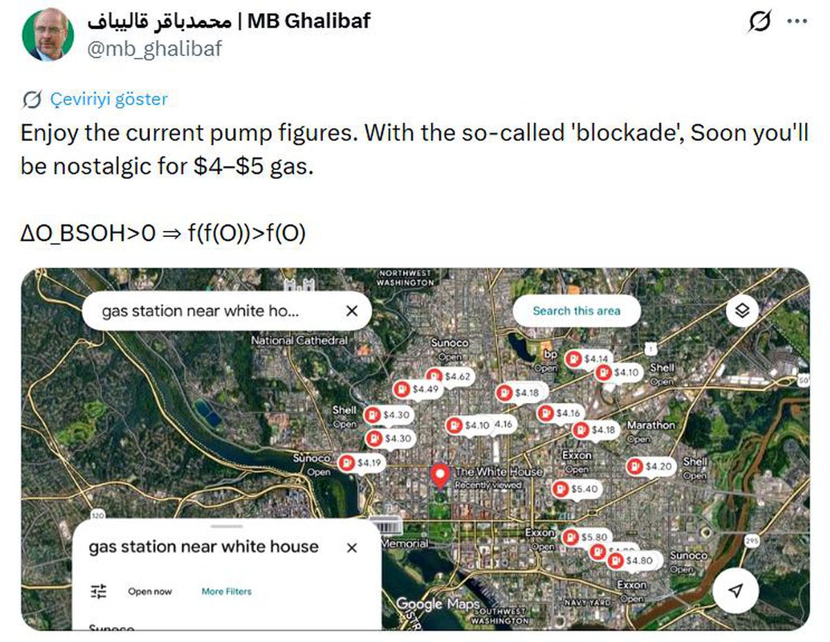 İran Meclis Başkanı Muhammed Bakır Galibaf, ABD'nin uygulamaya koyduğu deniz ablukasının benzin fiyatlarında ciddi artışlara neden olacağını belirtti. ABD'nin abluka kararı, İran'ın enerji ve ticaret damarlarında büyük sıkıntılar yaratacak.