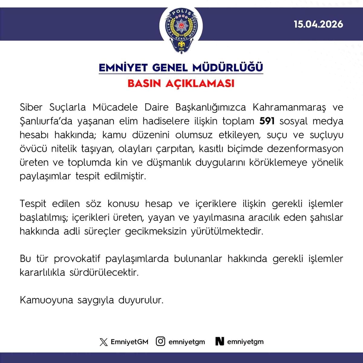 Emniyet Genel Müdürlüğü, Kahramanmaraş ve Şanlıurfa'daki saldırılarla ilgili dezenformasyon yayan 591 sosyal medya hesabı hakkında işlem yapıldığını duyurdu. Hesaplar ve içerik sağlayıcılar hakkında adli süreçler titizlikle yürütülmektedir.