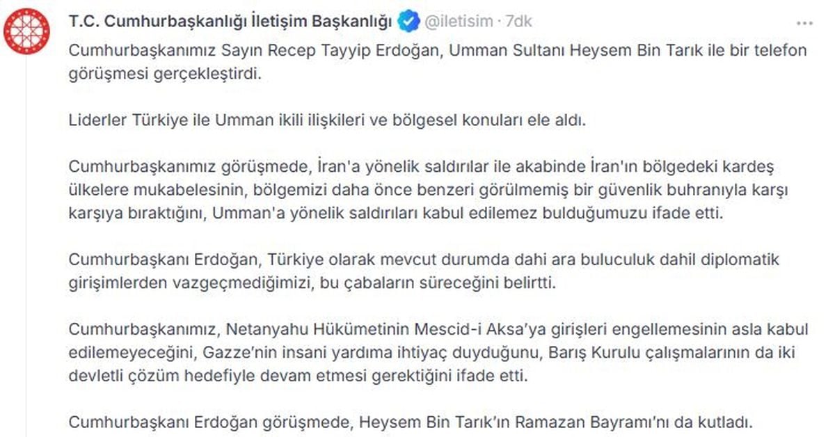 Cumhurbaşkanı Erdoğan, Umman Sultanı Heysem Bin Tarık ile gerçekleştirdiği telefon görüşmesinde Türkiye-Umman ilişkileri ile bölgedeki güvenlik krizlerini ele aldı. Erdoğan, İran ve İsrail politikalarına yönelik endişelerini paylaşarak diplomasiden vazgeçmediklerini belirtti.