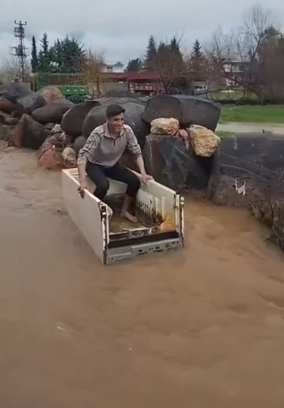 Mardin’de 3 gün süren sağanak yağışlar sonrası suyla dolan yollarda bir kişi, hurda buzdolabı kasası kullanarak ilerledi. Bu anlar cep telefonu kamerasıyla kaydedilerek sosyal medyada geniş yankı buldu.