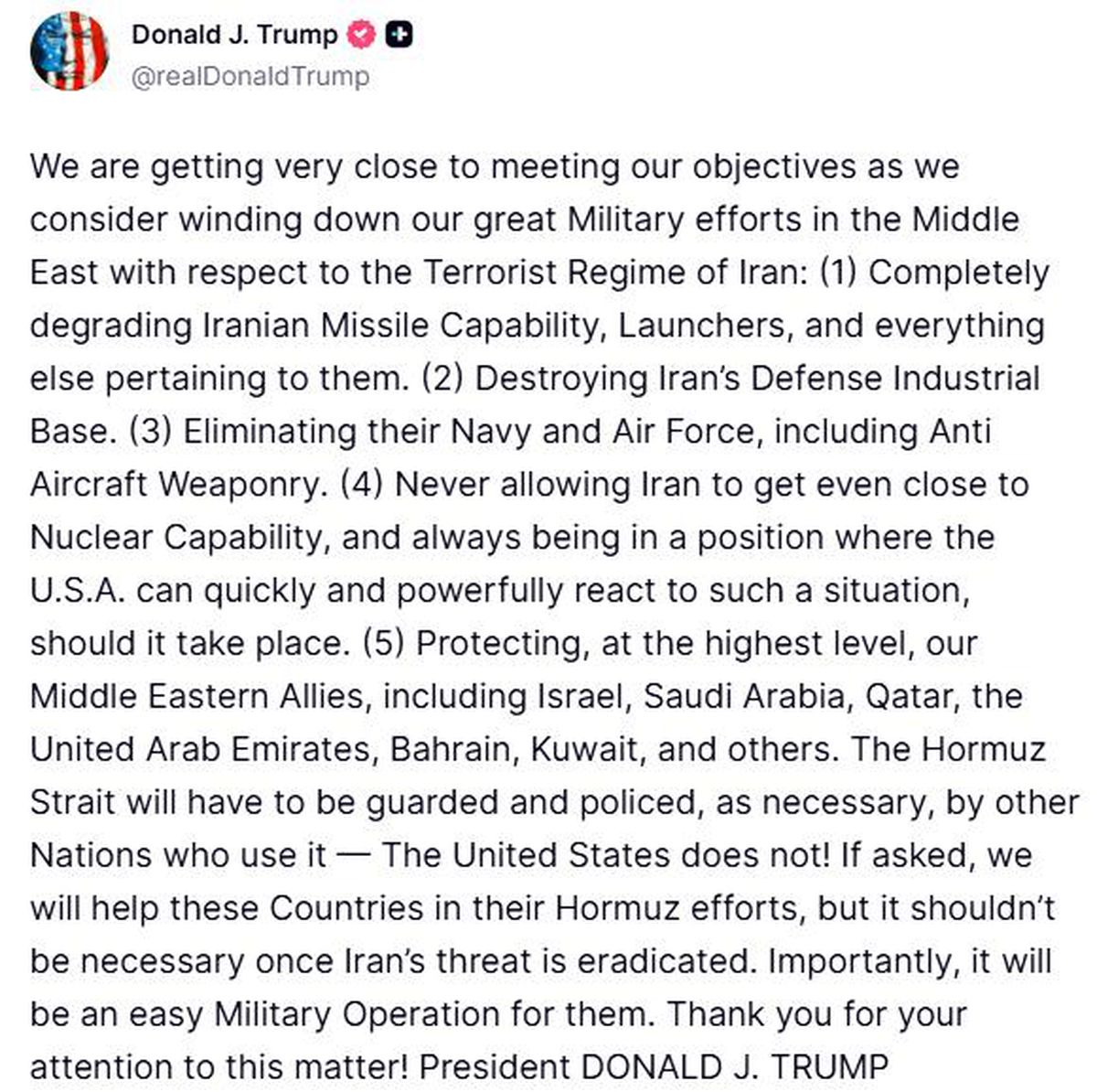 ABD Başkanı Donald Trump, İran'a yönelik askeri operasyonların kademeli olarak sona erebileceğini belirterek, Ortadoğu'daki stratejik hedeflerin büyük ölçüde gerçekleştirildiğini açıkladı. Hürmüz Boğazı'nın güvenliği konusunda ise bölge ülkelerinin sorumluluk alması gerektiğini vurguladı.