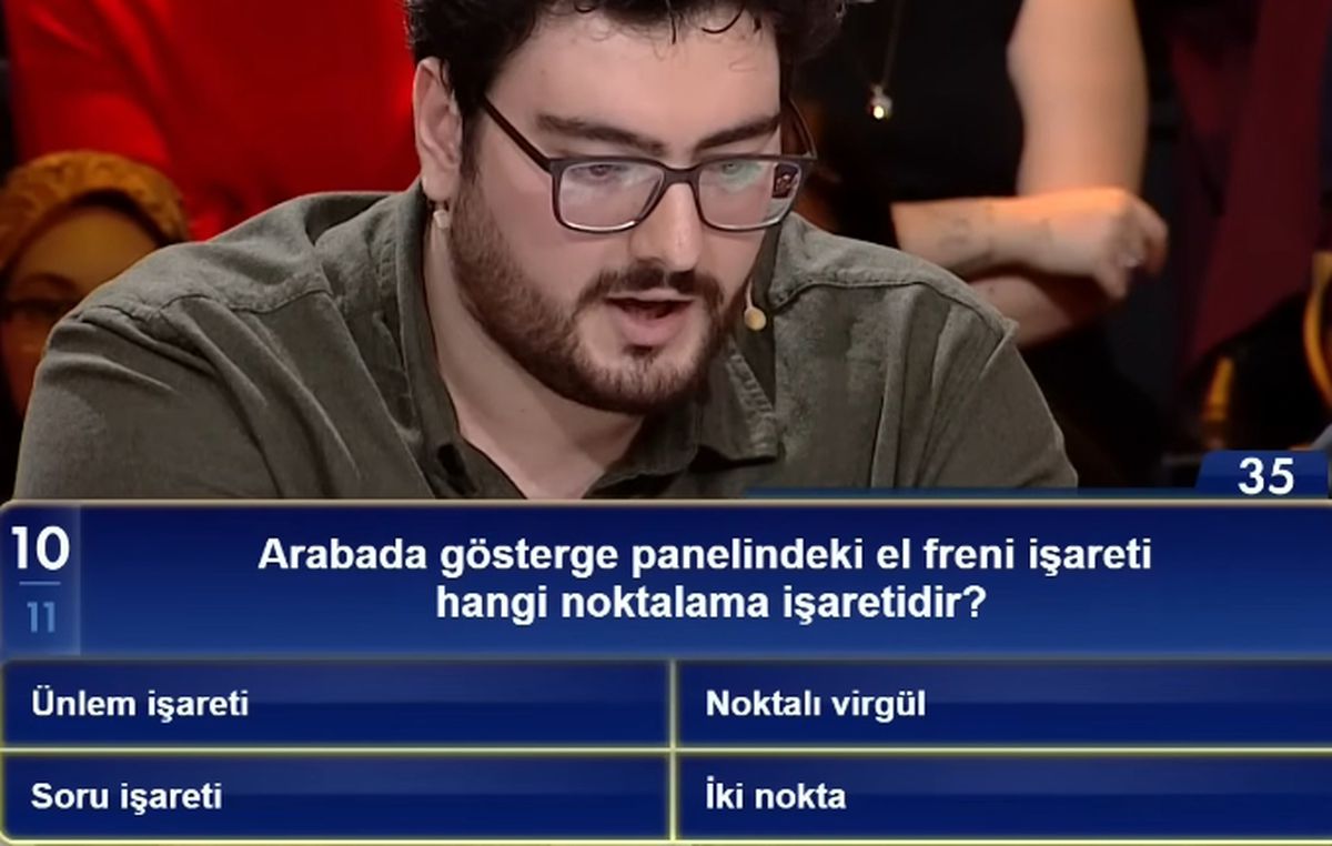 Beyaz’la Joker programında sorulan “Arabada gösterge panelindeki el freni işareti hangi noktalama işaretidir?” sorusu izleyicilerin merakını kamçılıyor. Program, Kanal D'de yayınlanmakta olup 3 milyon TL'lik büyük ödül için heyecan dolu bilgi yarışması sunuyor.