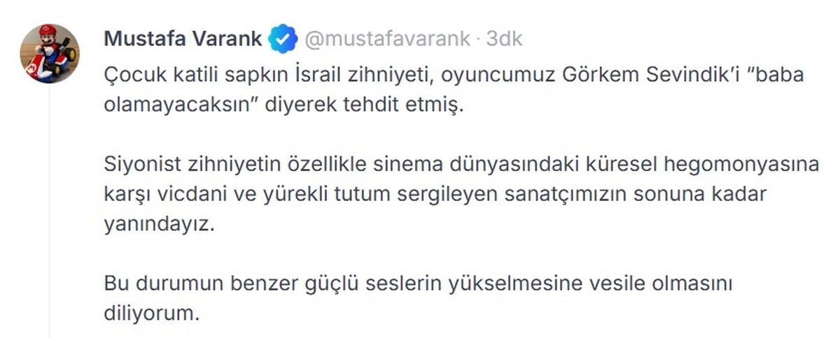 AK Parti Milletvekili Mustafa Varank, İsrail Ulusal Güvenlik Bakanı Ben Gvir’in tepkisini çeken oyuncu Görkem Sevindik’e güçlü destek verdi. Varank, sanal medyadaki paylaşımında sanatçının cesur tutumunun diğer seslerin yükselmesine öncülük etmesini diledi.
