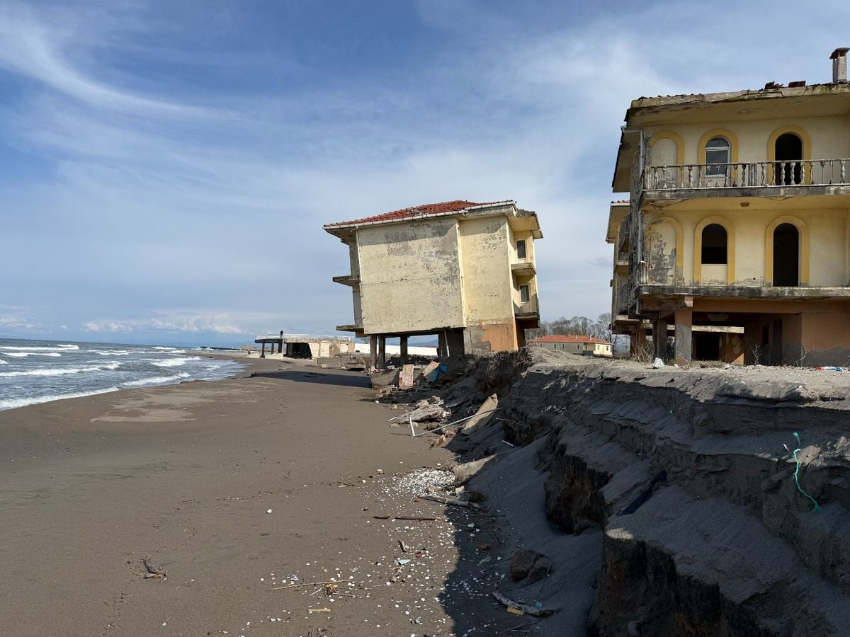 Karasu ilçesinde 2020 yılında kıyı erozyonu sebebiyle tahliye edilen 9 villadan biri yan yatarak tehlike oluşturdu. Yetkililer, risk taşıyan yapılar için yakında yıkım çalışmalarına başlayacak.