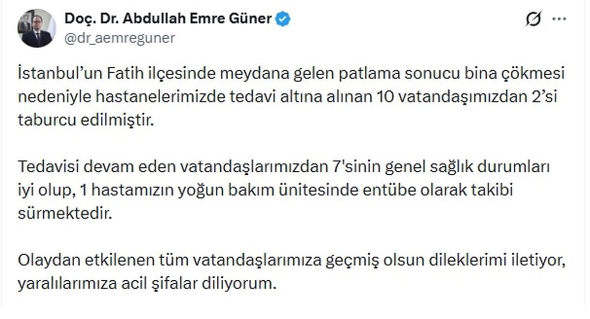 Fatih ilçesindeki patlamada yıkılan binalardan çıkarılan 10 yaralıdan 2 kişinin tedavisi tamamlandı ve taburcu edildi. İstanbul İl Sağlık Müdürü’nün açıklamasına göre, tedavi gören diğer 8 yaralıdan 1’i yoğun bakımda entübe halde bulunuyor.
