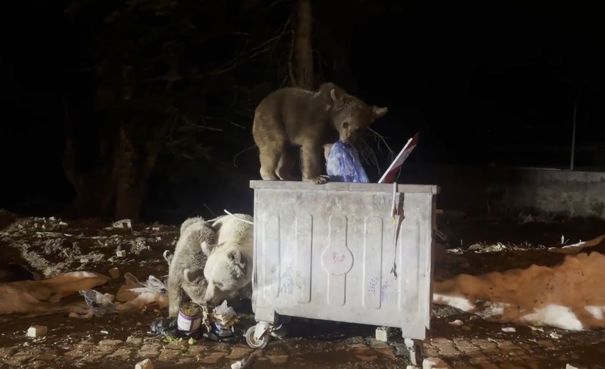 Uludağ'da 142 santimetreyi bulan kar kalınlığının ardından kış uykusundan uyanan 3'ü yavru 4 ayı, yiyecek aramak için Sarıalan bölgesindeki çöp konteynerlerine indi. O anlar, tatil için bölgede bulunan bir ziyaretçi tarafından cep telefonu ile kaydedildi.