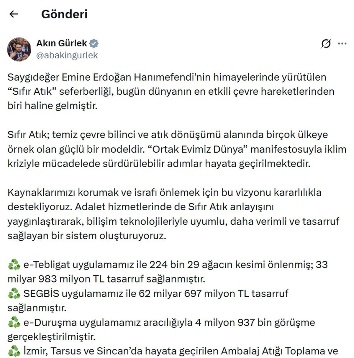 Adalet Bakanı Akın Gürlek, Sıfır Atık anlayışını dijital uygulamalarla entegre ederek büyük tasarruflar sağlandığını ve çevreci projelerle sürdürülebilir bir gelecek için çalışma yapıldığını açıkladı. e-Tebligat, SEGBİS ve e-Duruşma sistemleri sayesinde yüz milyonlarca lira tasarruf edildi.