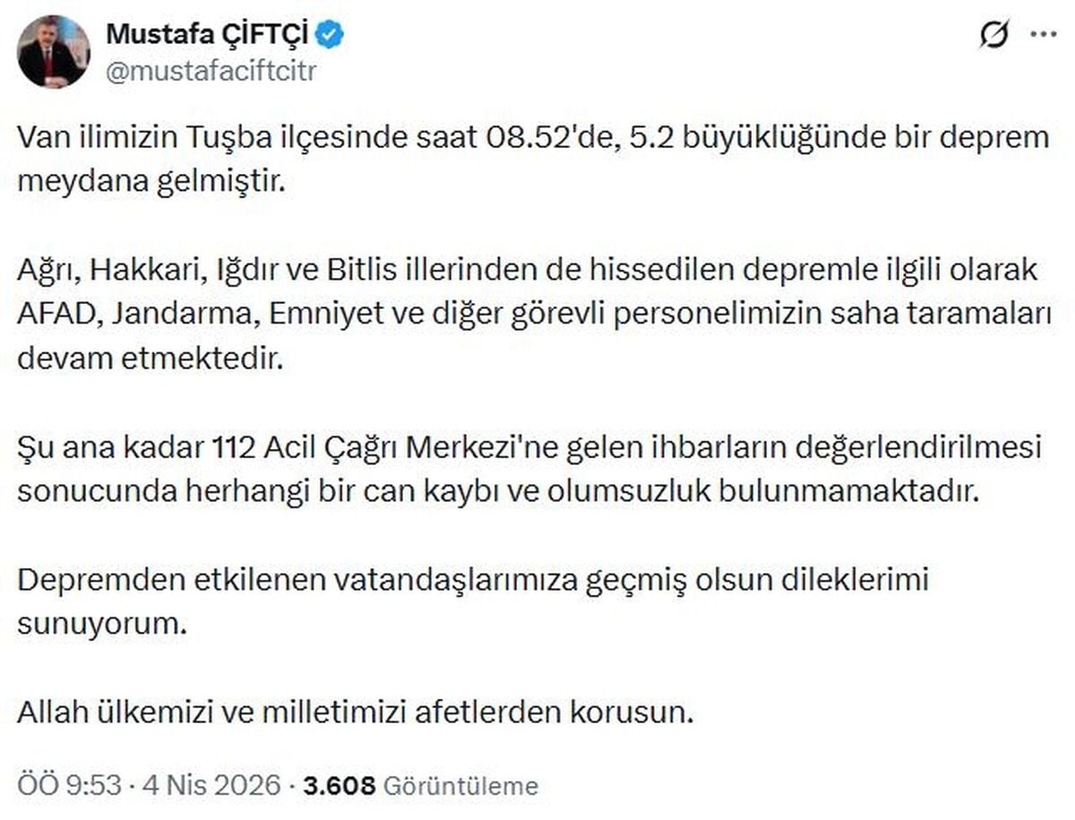 Van Tuşba merkezli 5.2 büyüklüğündeki deprem sonrası Bakanlar ekiplerin sahada olduğunu ve şu ana kadar herhangi bir can kaybı veya olumsuzluğun tespit edilmediğini bildirdi. İlgili tüm kurumlar süreci yakından takip etmeye devam ediyor.