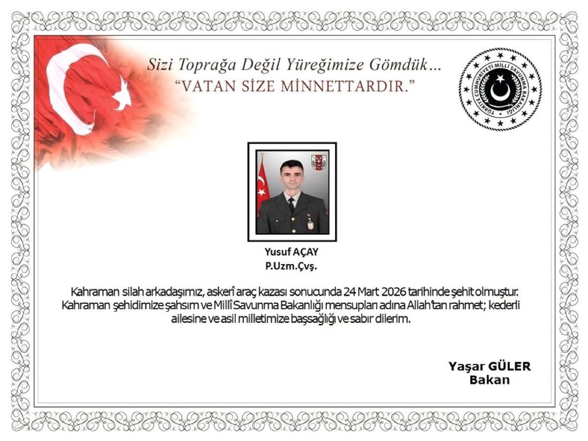 Ağrı'nın Doğubayazıt ilçesinde meydana gelen askeri araç kazasında Piyade Uzman Çavuş Yusuf Açay şehit olurken, bir asker de yaralandı. Milli Savunma Bakanlığı ve Bakan Yaşar Güler, konuyla ilgili başsağlığı mesajı yayımladı.