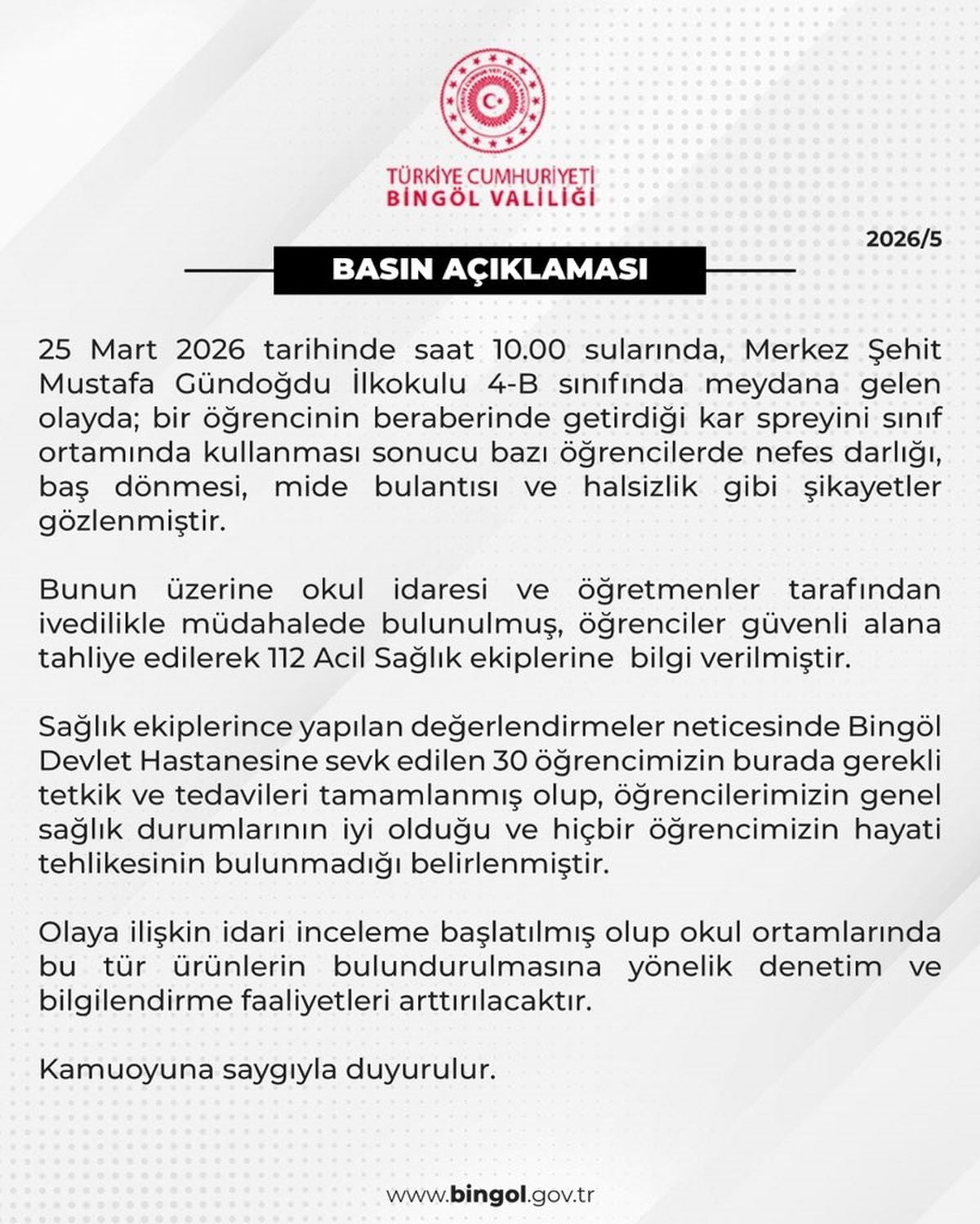 Bingöl'deki bir ilkokulda bir öğrencinin kar spreyi kullanması sonucu 30 öğrenci gazdan etkilenirken, sağlık durumlarının iyi olduğu bildirildi. Valilik olayla ilgili idari inceleme başlattı ve okullarda denetimler artırılacak.