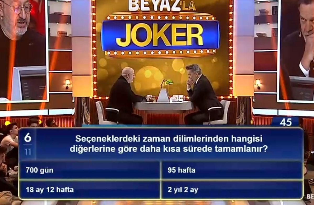 Beyaz'la Joker programında sorulan zaman dilimleriyle ilgili soru hızlıca gündem oldu; en kısa süren süre "18 ay 12 hafta" olarak belirlendi. Yarışma, yanlış cevapta elenmeyle heyecanı ve eğlenceyi artırıyor.