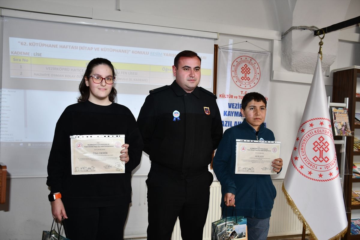 Samsun Vezirköprü'de 62. Kütüphane Haftası etkinlikleri kapsamında kitap okuma ve yarışmalarda başarı gösteren öğrencilere ödül töreni düzenlendi. Program, kitap sergisiyle son buldu.