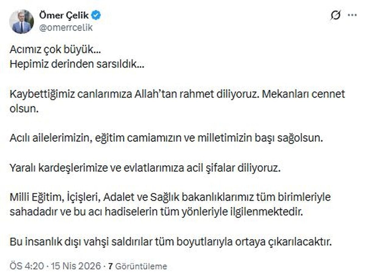 AK Parti Genel Başkan Yardımcısı ve Sözcüsü Ömer Çelik, Kahramanmaraş'ta okulda gerçekleşen saldırıya ilişkin derin üzüntüsünü paylaştı ve kayıplar için Allah’tan rahmet diledi. Bakanlıkların olayın tüm boyutlarıyla ilgilendiği ifade edildi.