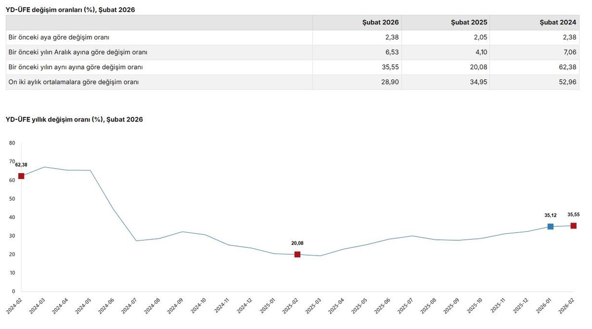 TÜİK verilerine göre, şubat ayında yurt dışı üretici fiyat endeksi aylık %2,38, yıllık ise %35,55 oranında artış kaydetti. Sanayinin madencilik ve imalat sektörlerinde de kayda değer fiyat artışları görüldü.
