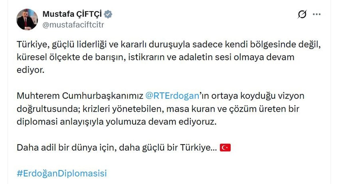 İçişleri Bakanı Mustafa Çiftçi, Türkiye’nin sadece bölgesinde değil küresel ölçekte de barış, istikrar ve adaletin teminatı olduğunu açıkladı. Bakan Çiftçi, Cumhurbaşkanı Erdoğan’ın vizyonuyla krizleri yönetip çözüm odaklı diplomasi anlayışı benimsediklerini vurguladı.