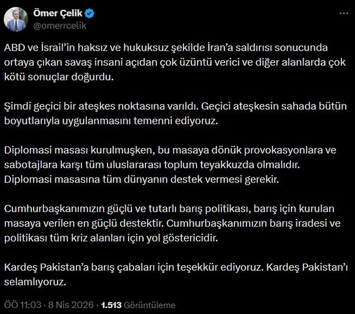 AK Parti Sözcüsü Ömer Çelik, geçici ateşkesin tüm sahada eksiksiz uygulanması temennisinde bulunarak, uluslararası toplumun diplomasi masasına yönelik provokasyonlara karşı teyakkuzda olması gerektiğini vurguladı.