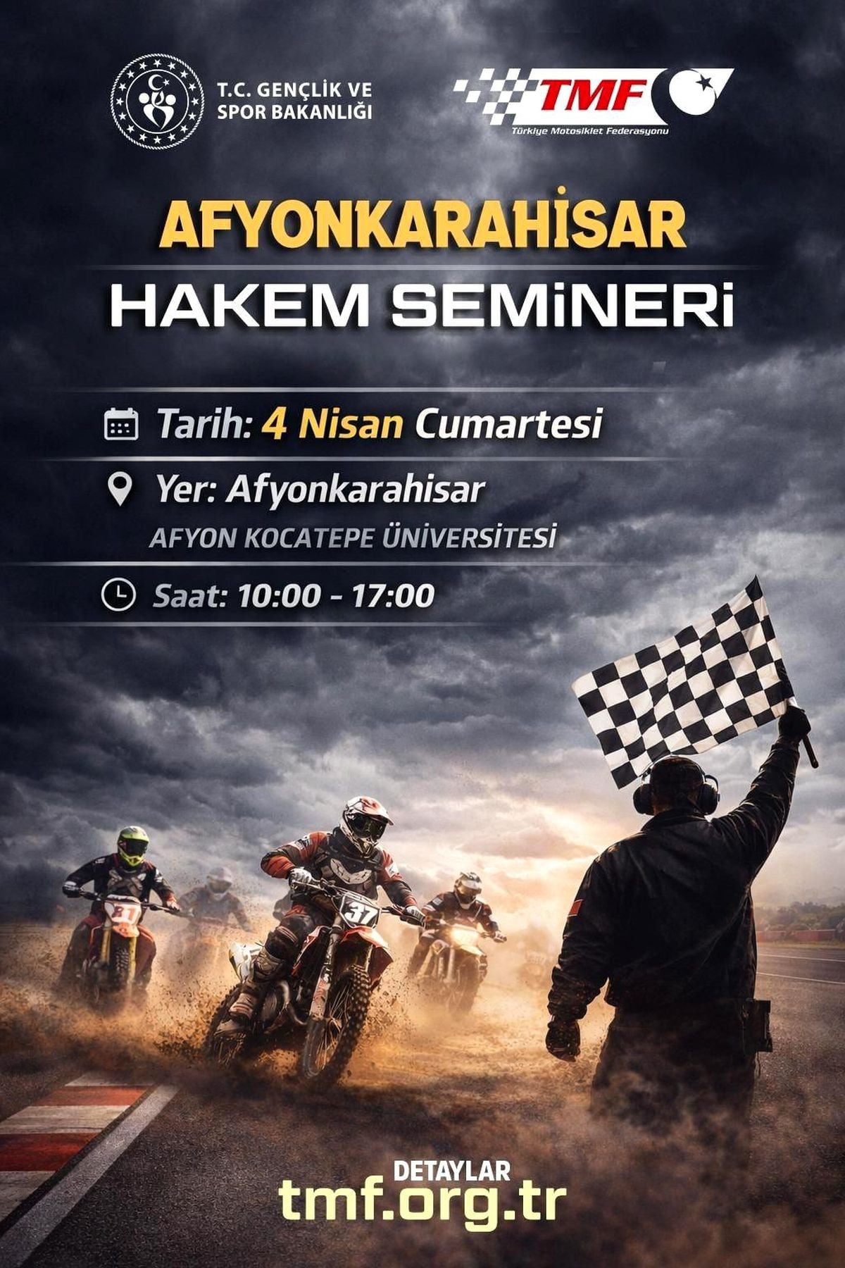Afyon Kocatepe Üniversitesi'nde 4 Nisan'da motosiklet aday hakem kursu ve lisans yenileme semineri düzenlenecek. Seminer, motosiklet hakemliği yapmak isteyenler ve mevcut hakemler için saat 10.00-17.00 arasında gerçekleştirilecek.