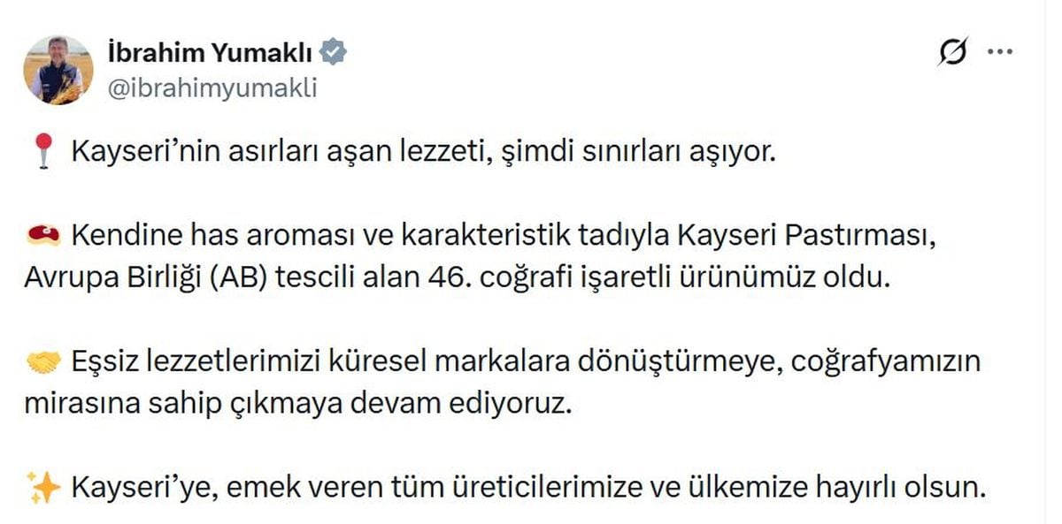 Kayseri pastırması, Avrupa Birliği’nden coğrafi işaret tescili alarak Türkiye’nin 46’ncı tescillenmiş ürünü oldu. TOBB ve Tarım Bakanlığı tarafından yürütülen titiz çalışmalar sonucunda bu önemli başarı sağlandı.