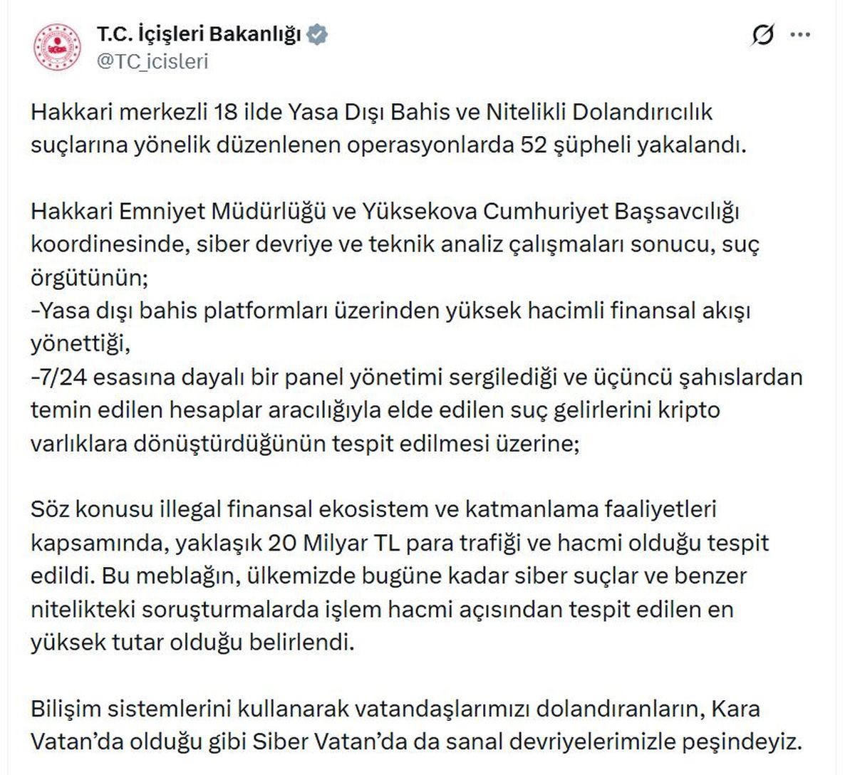 İçişleri Bakanlığı, Hakkari öncülüğünde yasa dışı bahis ve dolandırıcılık faaliyetlerine yönelik düzenlenen operasyonda 52 kişiyi gözaltına aldı. Operasyonda yaklaşık 20 milyar TL'lik yasa dışı finansal işlem hacmi tespit edildi.