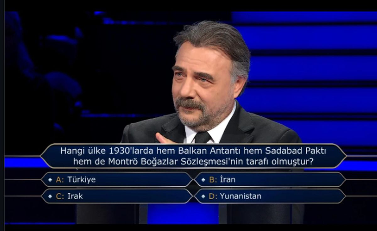 Kim Milyoner Olmak İster’in yeni bölümünde 1930'larda Balkan Antantı, Sadabad Paktı ve Montrö Boğazlar Sözleşmesi'nin tarafı olan ülke sorusu yarışmacılar ve izleyiciler arasında heyecan yarattı. Bu kritik sorunun doğru cevabı Türkiye olarak belirlendi.