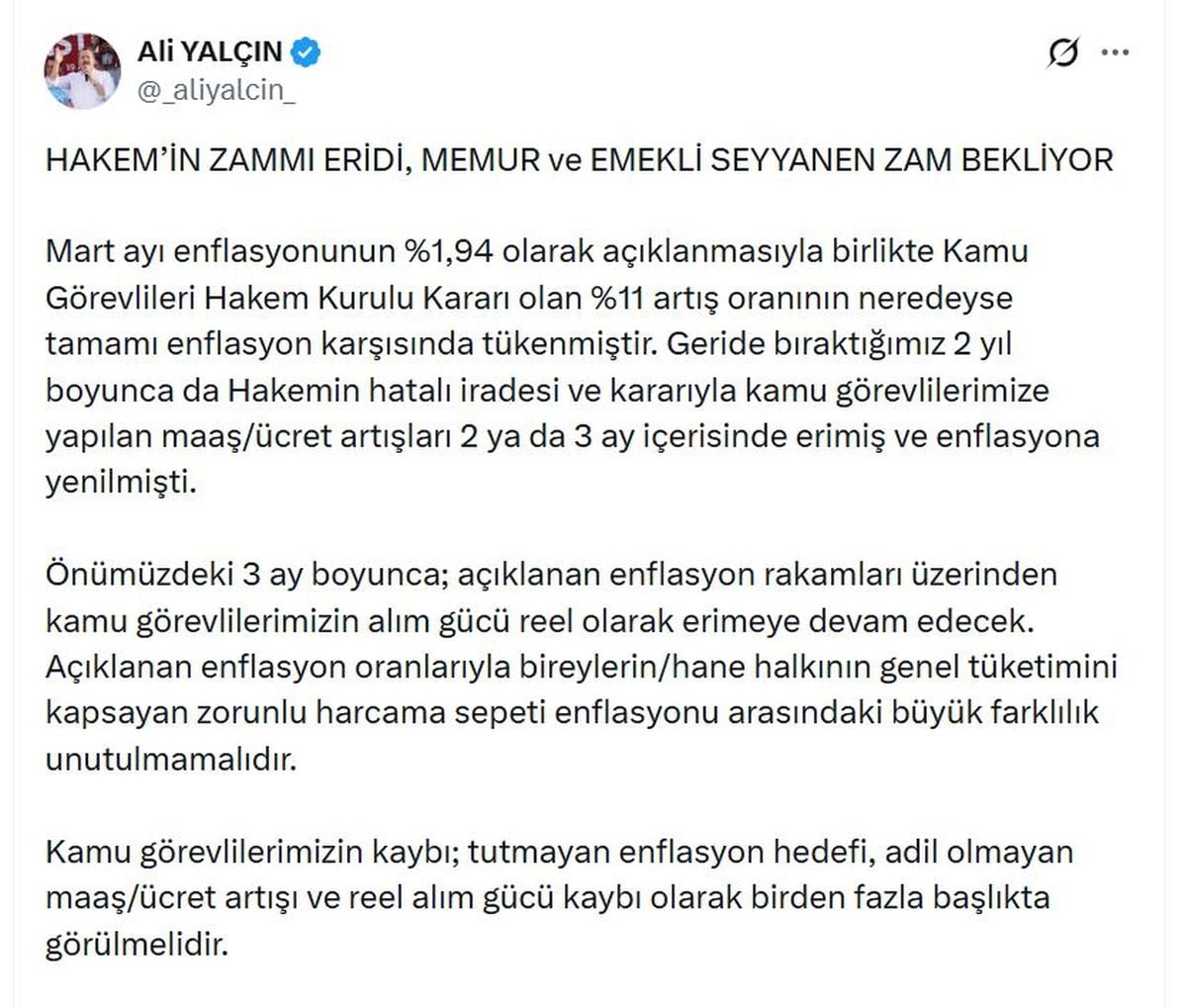 Memur-Sen Başkanı Ali Yalçın’dan TÜİK’in Mart Ayı Enflasyon Verilerine Sert Eleştiri: Memur ve Emekliler İçin Seyyanen Zam Talebi