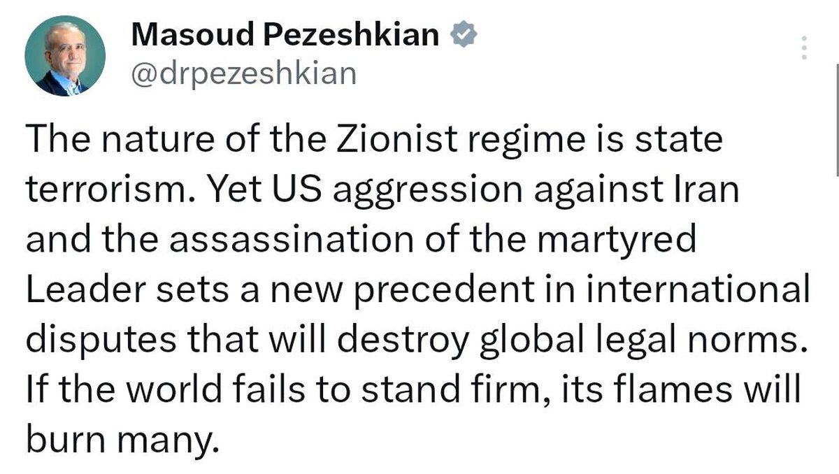 İran Cumhurbaşkanı Mesud Pezeşkiyan, ABD ve İsrail’in İran’a yönelik saldırgan tutumunun uluslararası hukuk normlarına aykırı olduğunu belirterek, dünya kamuoyunu bu duruma karşı kararlı durmaya çağırdı.