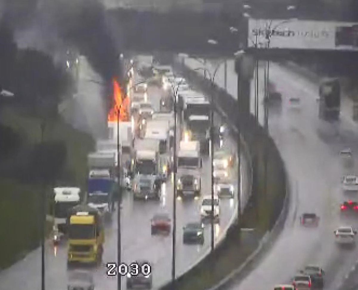 TEM Otoyolu Tuzla Orhanlı Mevkiinde TIR Yangını Trafiği Olumsuz Etkiliyor