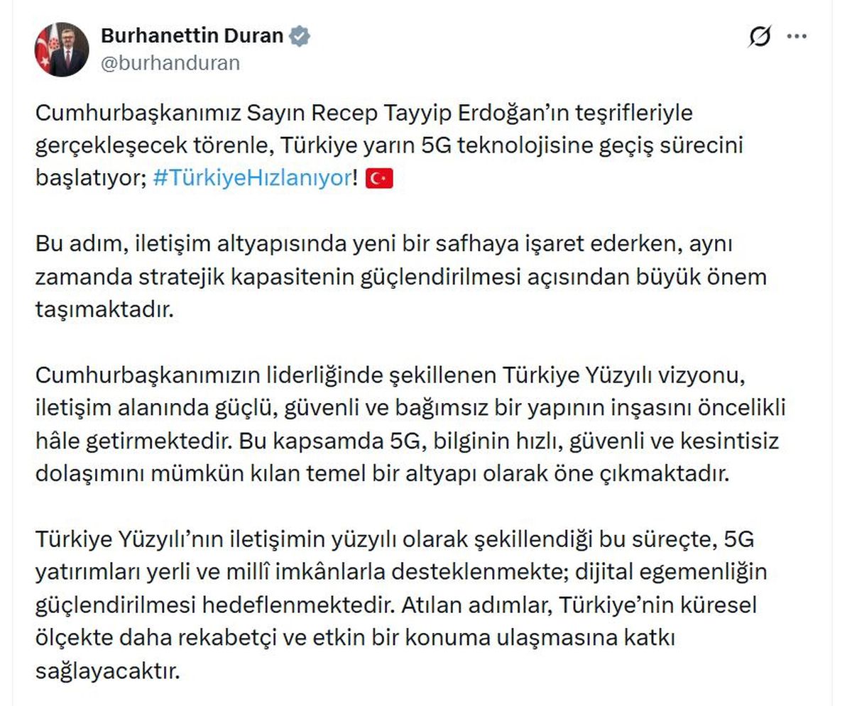 İletişim Başkanı Burhanettin Duran, Türkiye'nin 5G teknolojisine geçiş sürecini başlattığını ve bu adımın yerli milli imkanlarla yürütülerek dijital egemenliği güçlendireceğini açıkladı. 5G yatırımları, iletişim altyapısını güçlendirirken sağlık, savunma ve akıllı şehirler gibi kritik alanlarda da önemli dönüşümler sağlayacak.