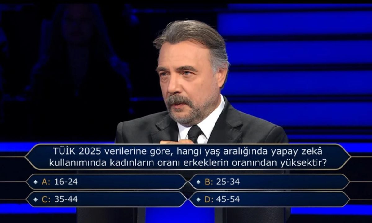 Türkiye İstatistik Kurumu’nun 2025 verilerine göre yapay zekâ kullanımında kadınların erkeklerden daha yüksek orana sahip olduğu yaş grubu belirlendi. “Kim Milyoner Olmak İster” yarışmasında bu soruya verilen cevaplar büyük ilgi topladı.