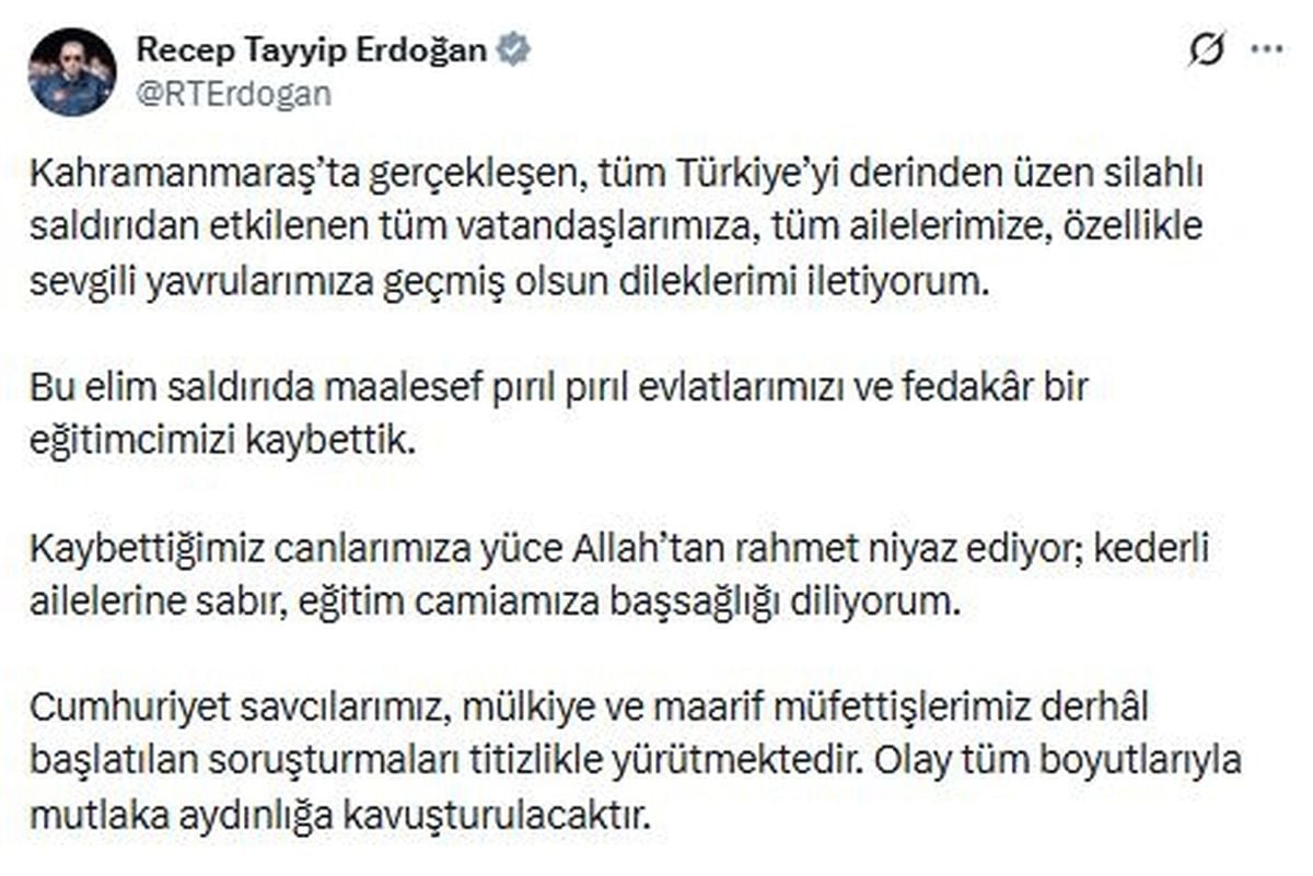 Cumhurbaşkanı Erdoğan, Kahramanmaraş’ta gerçekleşen silahlı okul saldırısında hayatını kaybedenlere rahmet diledi, soruşturmanın titizlikle sürdüğünü belirtti. Ayrıca, olayın siyasi polemik konusu yapılmaması çağrısında bulundu.
