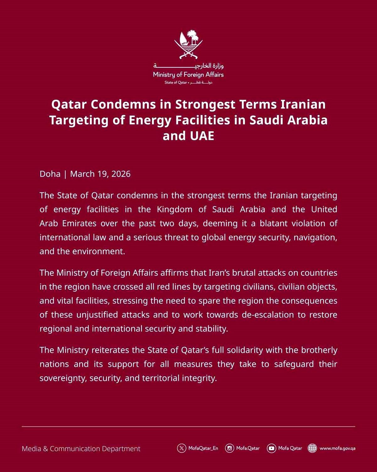 Katar Dışişleri Bakanlığı, İran’ın Suudi Arabistan ve BAE’deki enerji tesislerine yaptığı saldırıları uluslararası hukuk ihlali ve bölgesel istikrara ciddi tehdit olarak nitelendirdi. Katar, bölgesel gerilimin azaltılması ve enerji güvenliğinin sağlanması gerektiğini vurguladı.