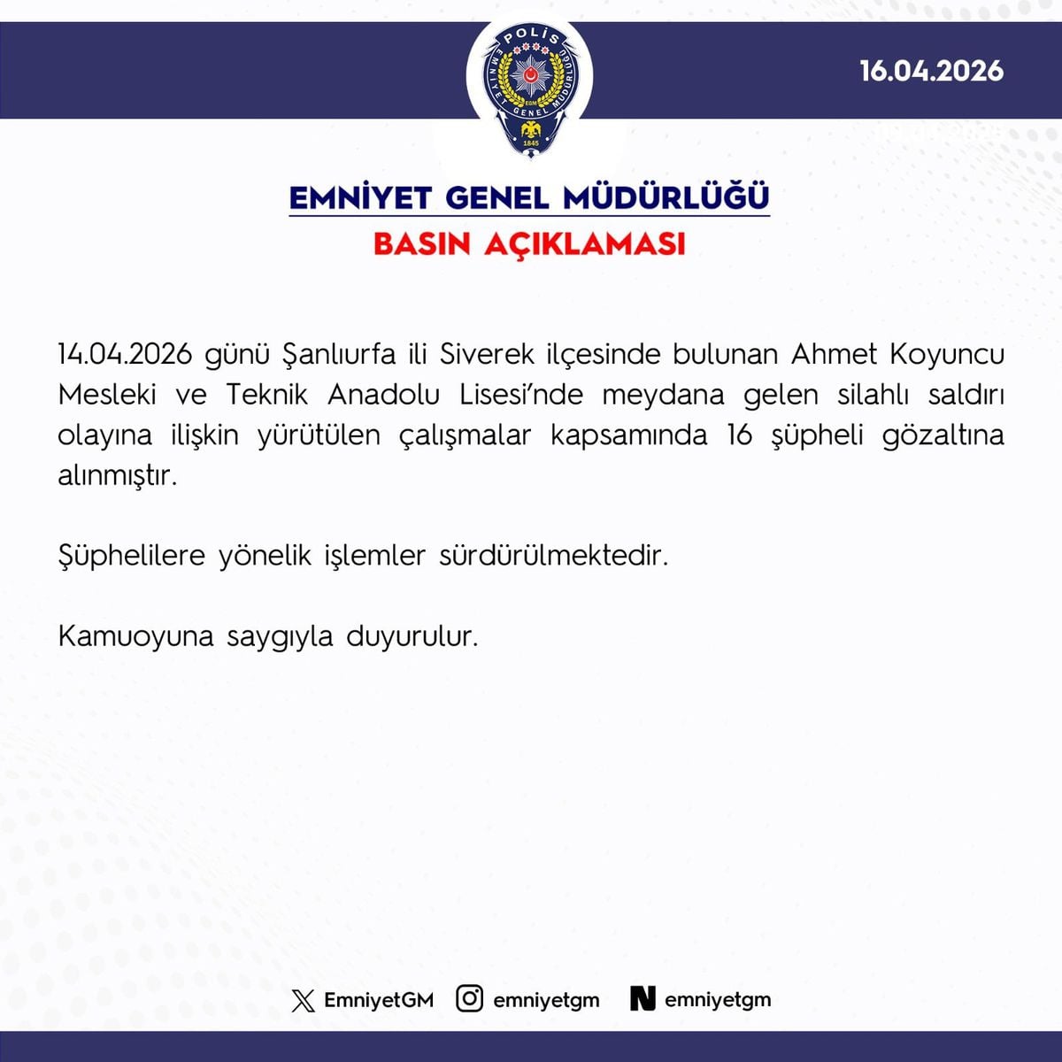 Emniyet Genel Müdürlüğü tarafından yapılan açıklamaya göre, Şanlıurfa’nın Siverek ilçesinde bulunan Ahmet Koyuncu Mesleki ve Teknik Anadolu Lisesi’nde gerçekleşen silahlı saldırı olayıyla ilgili toplam 16 şüpheli şahıs gözaltına alınmıştır. Olayın gerçekleştiği 14 Nisan 2026 tarihinden itibaren yürütülen titiz soruşturma sonucunda bu kişiler tespit edilerek emniyet güçleri tarafından yakalanmıştır.