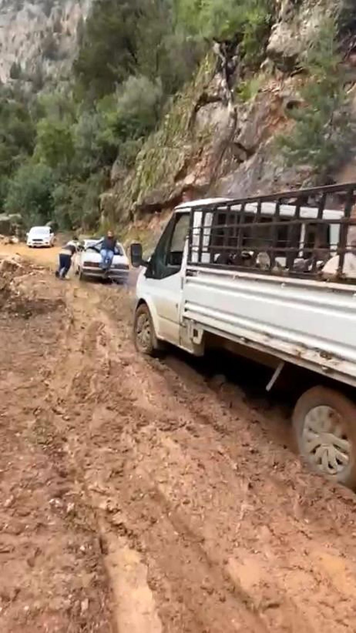 Antalya Serik'te heyelan sonucu yola yayılan toprak ve yağış nedeniyle oluşan çamur, sürücülerin zor anlar yaşamasına neden oldu. Kaygan zemin üzerine kayarak şarampole yuvarlanan kamyonetin kurtarılması için traktör müdahale etti.