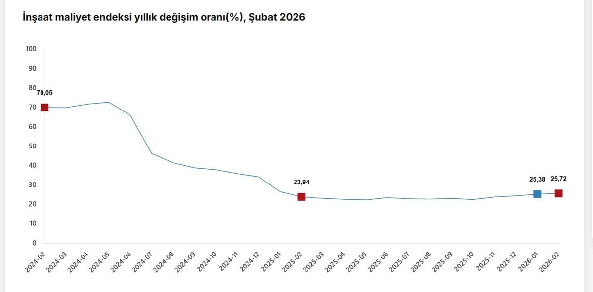 TÜİK verilerine göre inşaat maliyet endeksi Şubat 2026'da aylık %1,51, yıllık ise %25,72 oranında yükseldi. Malzeme ve işçilik fiyatlarındaki artışlar maliyetlerde önemli etkiye sahip oldu.