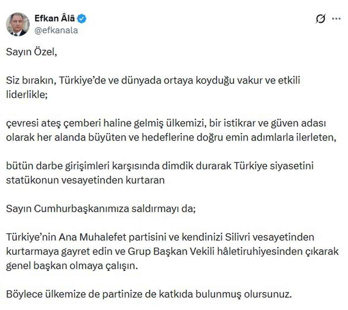 AK Parti Genel Başkan Vekili Efkan Ala, CHP Grup Başkanvekili Özel’i Cumhurbaşkanına yönelik eleştirilerini bırakmaya ve Silivri vesayetinden kurtularak genel başkan olmaya davet etti. Ala, Türkiye’nin istikrarını sağlayan liderliğe destek verilmesi gerektiğini vurguladı.