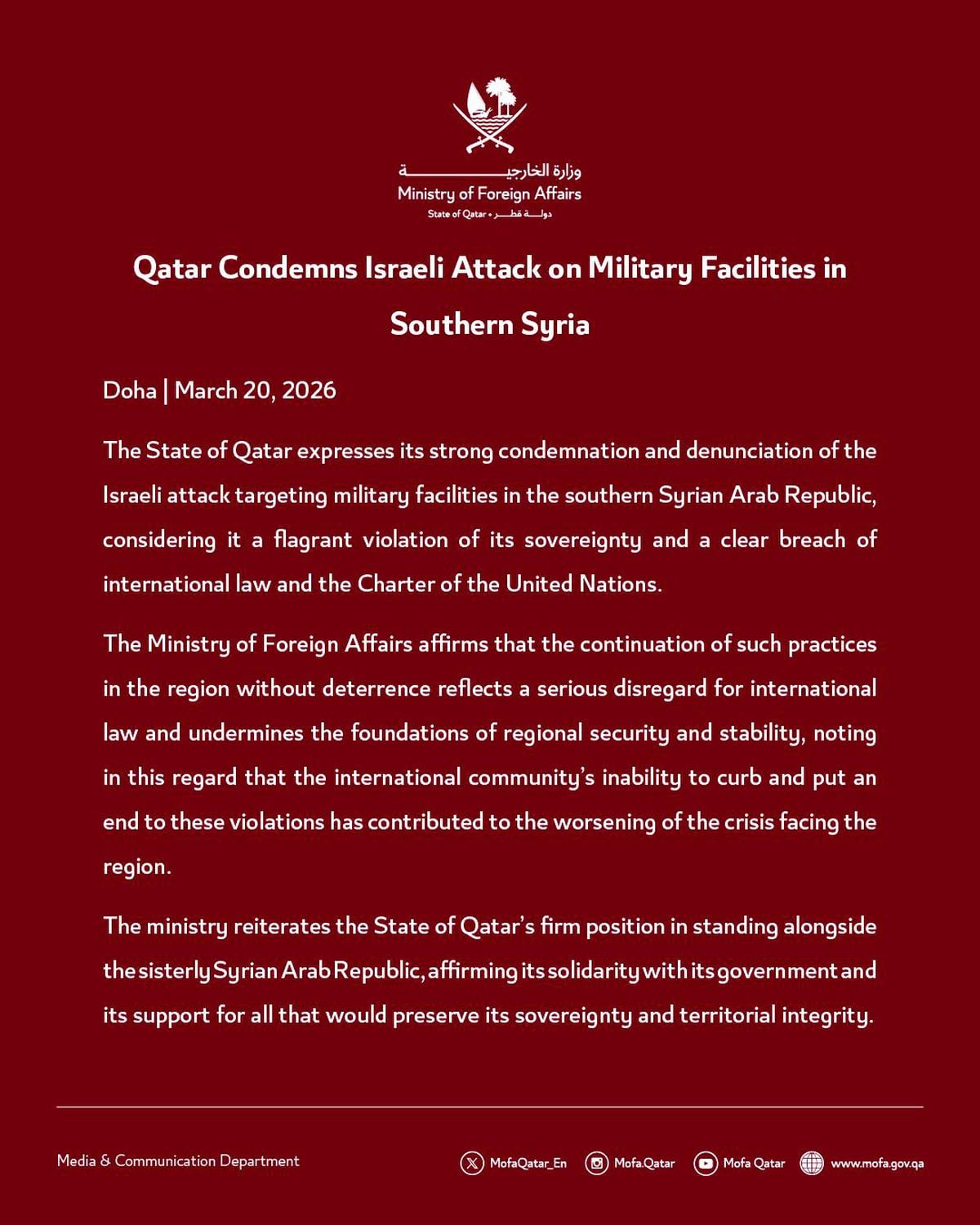 Katar Dışişleri Bakanlığı, İsrail'in Suriye'deki askeri altyapılara yönelik saldırılarını uluslararası hukuk ve Birleşmiş Milletler sözleşmesinin ihlali olarak kınadı. Katar, Suriye'nin egemenliği ve toprak bütünlüğü için dayanışma mesajı verdi.