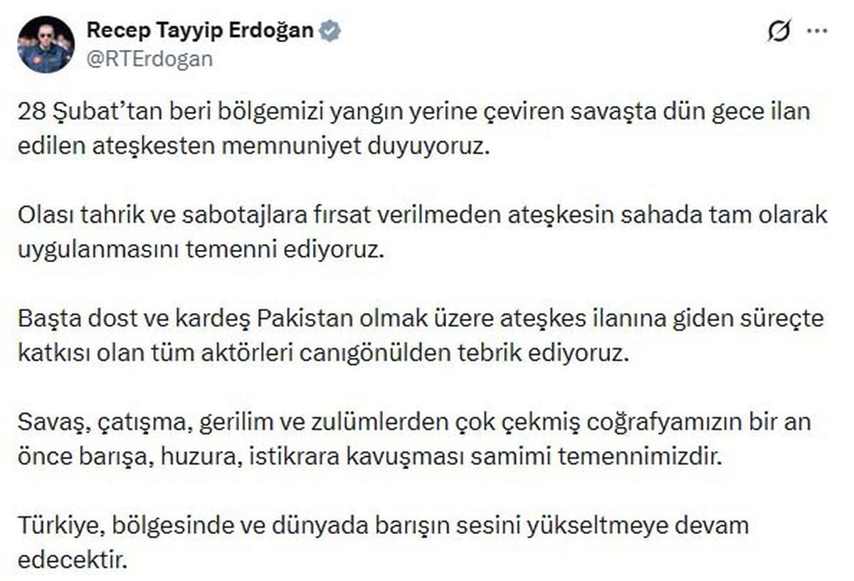 Cumhurbaşkanı Erdoğan, bölgede 28 Şubat'tan beri devam eden savaşta dün gece ilan edilen ateşkesi olumlu karşılayarak, sahada tam uygulanmasını temenni etti. Türkiye'nin barış için çabalarını sürdüreceğini vurguladı.