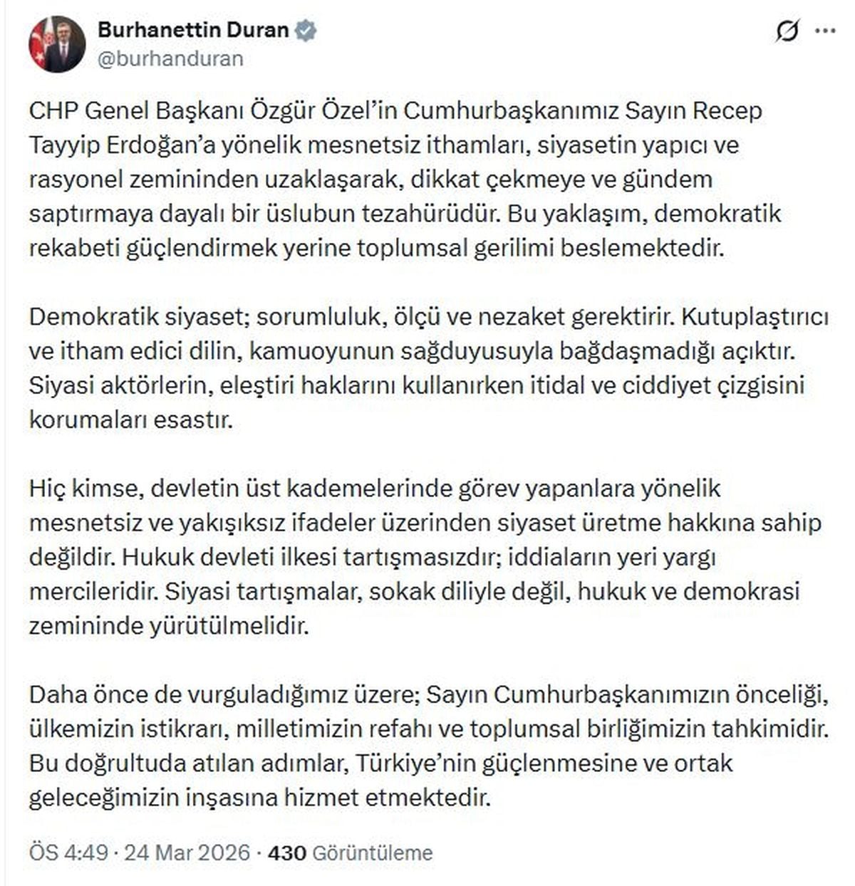 İletişim Başkanı Burhanettin Duran, CHP Genel Başkanı Özgür Özel'in Cumhurbaşkanı Erdoğan'a yönelik asılsız suçlamalarını sert bir dille eleştirerek, siyasetin yapıcı ve saygılı olması gerektiğini belirtti.