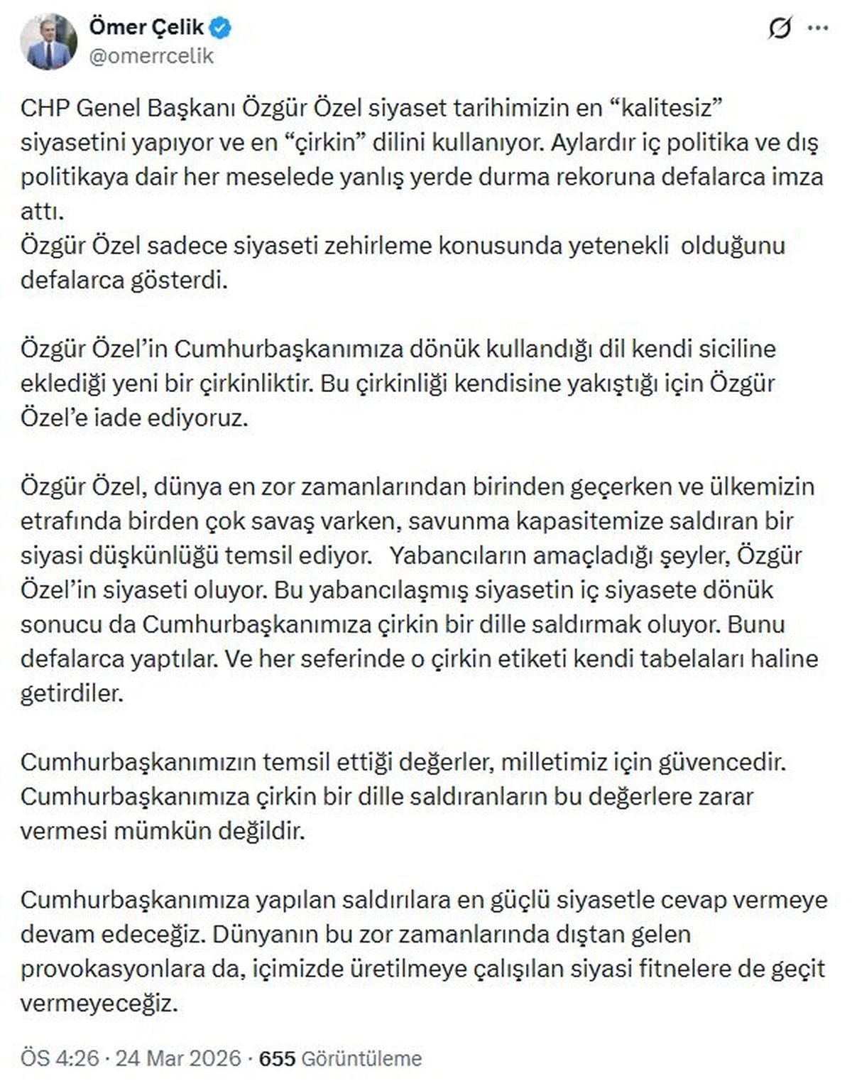 AK Parti Sözcüsü Ömer Çelik, CHP'li Özgür Özel'in zor dönemde ülkenin savunmasına yönelik eleştirilerini sert bir dille eleştirerek, bunun yabancı güçlerin amaçları doğrultusunda yapıldığını ifade etti. Çelik, Cumhurbaşkanı'na yönelik saldırılara karşı güçlü siyasetle cevap verileceğini vurguladı.