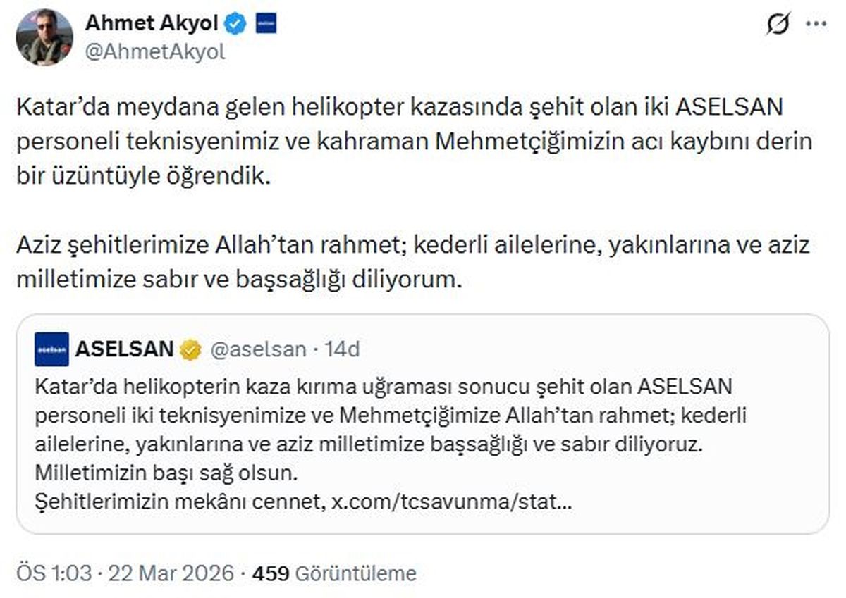 ASELSAN Genel Müdürü Ahmet Akyol, Katar'daki helikopter kazasında hayatını kaybeden ASELSAN personeli ve Mehmetçik için taziye mesajı yayımladı. Akyol, şehitlere rahmet ve ailelerine sabır diledi.