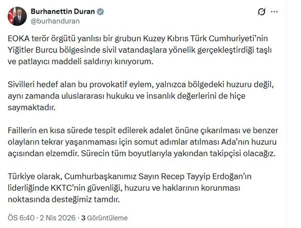 İletişim Başkanı Burhanettin Duran, Kuzey Kıbrıs Türk Cumhuriyeti'nde sivillere yapılan taş ve patlayıcı maddeli saldırıyı sert şekilde kınadı ve faillerin adalet önüne çıkarılması gerektiğini vurguladı. Türkiye, KKTC’nin güvenliği ve huzurunu korumaya kararlı olduğunu açıkladı.